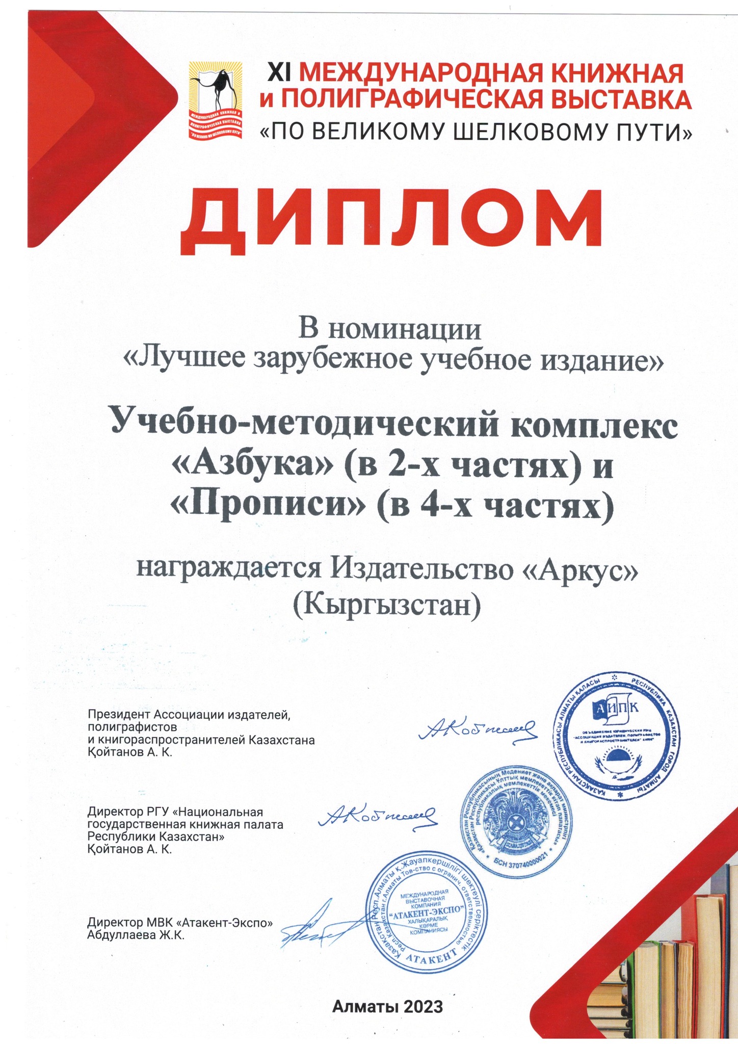 1-класстардын «Азбука» ОМКсынын адаптацияланган варианты (авторлору В. Г. Горецкий ж.б.) 22–24-ноябрда Алматы шаарында өткөн «Улуу Жибек жолунда» аттуу 11-эл аралык китеп жана полиграфия көргөзмөсүндө жогорку сыйлыкка татыды.